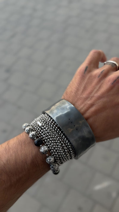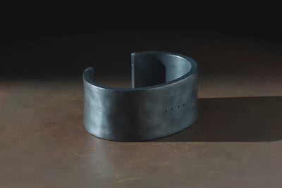 צמיד פתוח בעבודת יד, עשוי פליז בציפוי כסף מחומצן. עובר גימור Destroyed Rework ייחודי המתפתח עם הזמן לפטינה טבעית, כך שכל פריט מקבל אופי אישי ומתפתח עם השימוש.