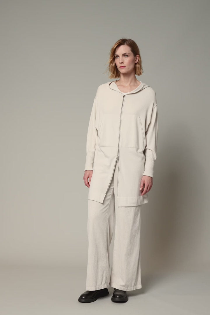 A stylish and spacious maxi-length hoodie designed with a blend of viscose, wool, and polyamide. This garment-dyed hoodie includes a large, comfortable hood and double-slider zip closure. Wide volume and high rib cuffs on the sleeves add both comfort and warmth, making it ideal for cooler days.