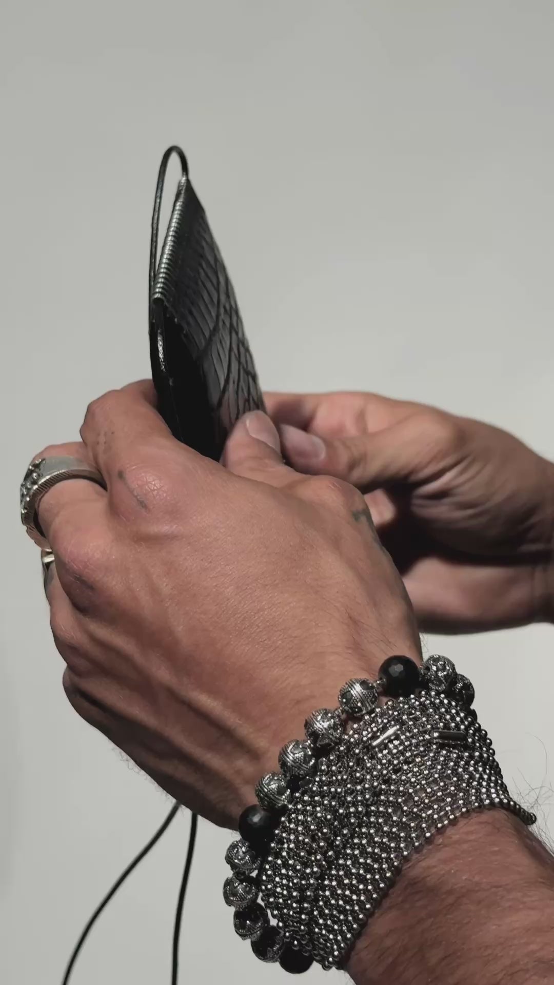 This handcrafted wallet from Isaac Sellam embodies a refined balance between craftsmanship and contemporary design. Constructed entirely from genuine alligator leather, it presents a structured, articulated form enriched with staple seam details and subtle leather cord accents. Each piece undergoes a meticulous hand-dyeing process, resulting in a singular surface texture and tone that emphasize the individuality of the leather. The compact layout includes three card slots and a dedicated coin compartment, providing functional organization within a sculptural silhouette.