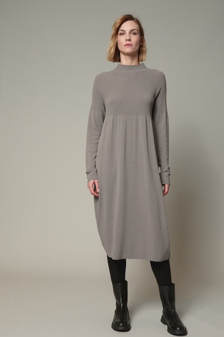 Изысканное платье-водолазка с длинными рукавами, выполненное из смеси вискозы, шерсти и полиамида. Это платье имеет ребристый воротник, переходящий в корпус и рукава, а затем переходящий в более свободную резинку под грудью и на рукавах, что создает легкий, струящийся объем.