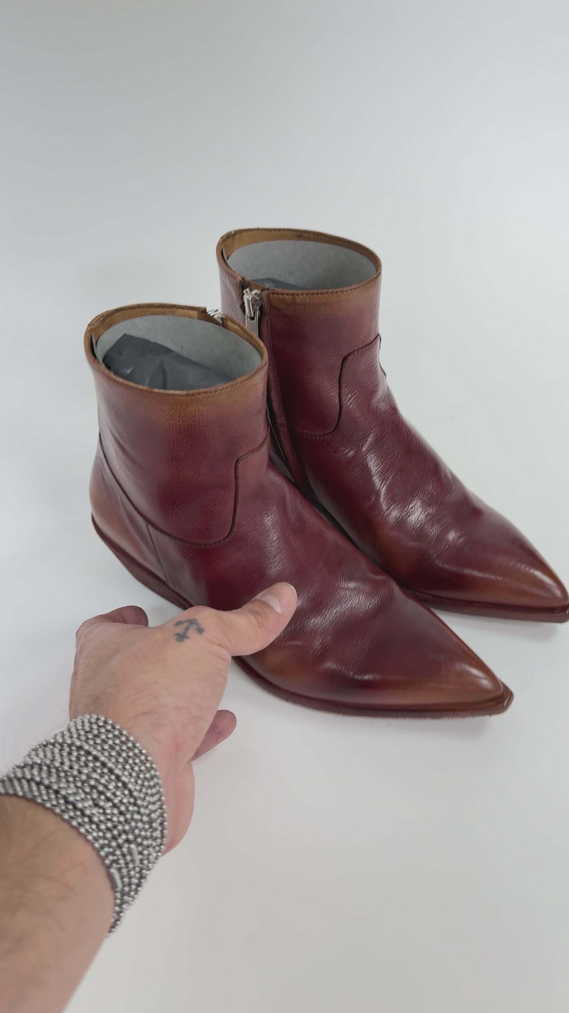 מגפי העקב Ankle Boots של Officine Creative מגלמים את מהות האומנות האיטלקית המסורתית. עור פרימיום בגוון חום אדמוני עמוק, עיצוב מדויק וגימור ידני מושלם - כל אלה יוצרים יחד פריט הנצחי שמשלב אלגנטיות קלאסית עם נגיעות בוקריות מעודנות.