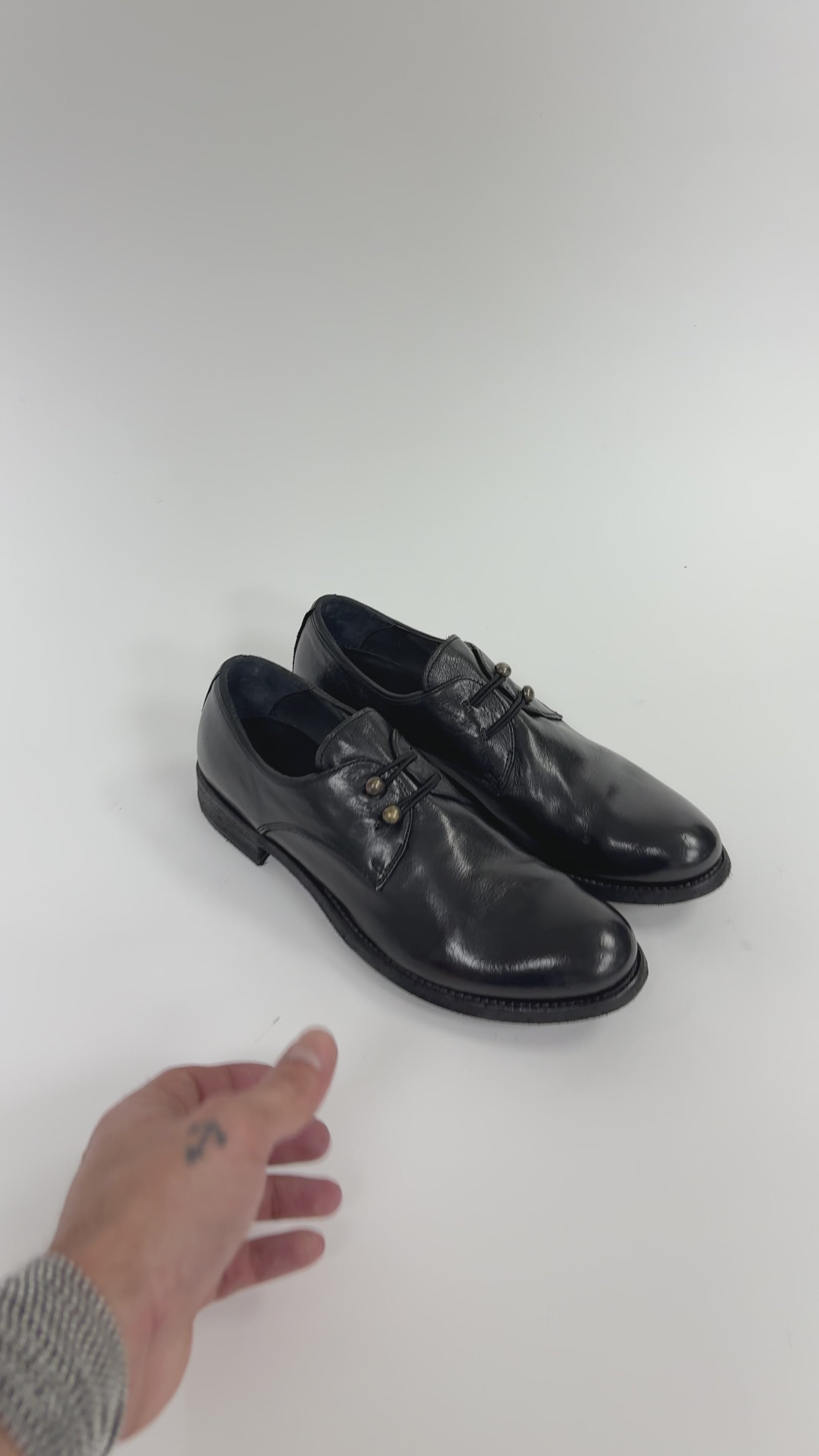 העור השחור בעל המרקם הטבעי והמבריק קלות מעניק לנעליים אופי אותנטי ומתוחכם. הגזרה הצמודה והנמוכה יוצרת סילואט קלאסי עם נגיעות של וינטג', בעוד שהתפרים העדינים והגלויים מדגישים את המומחיות האומנותית. פרט עיצובי ייחודי הוא סגירת השרוכים באמצעות גולות מתכת בגוון ברונזה כהה, המעניקות מראה של עיצוב בעבודת יד ומוסיפות עומק ואופי.